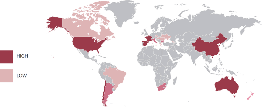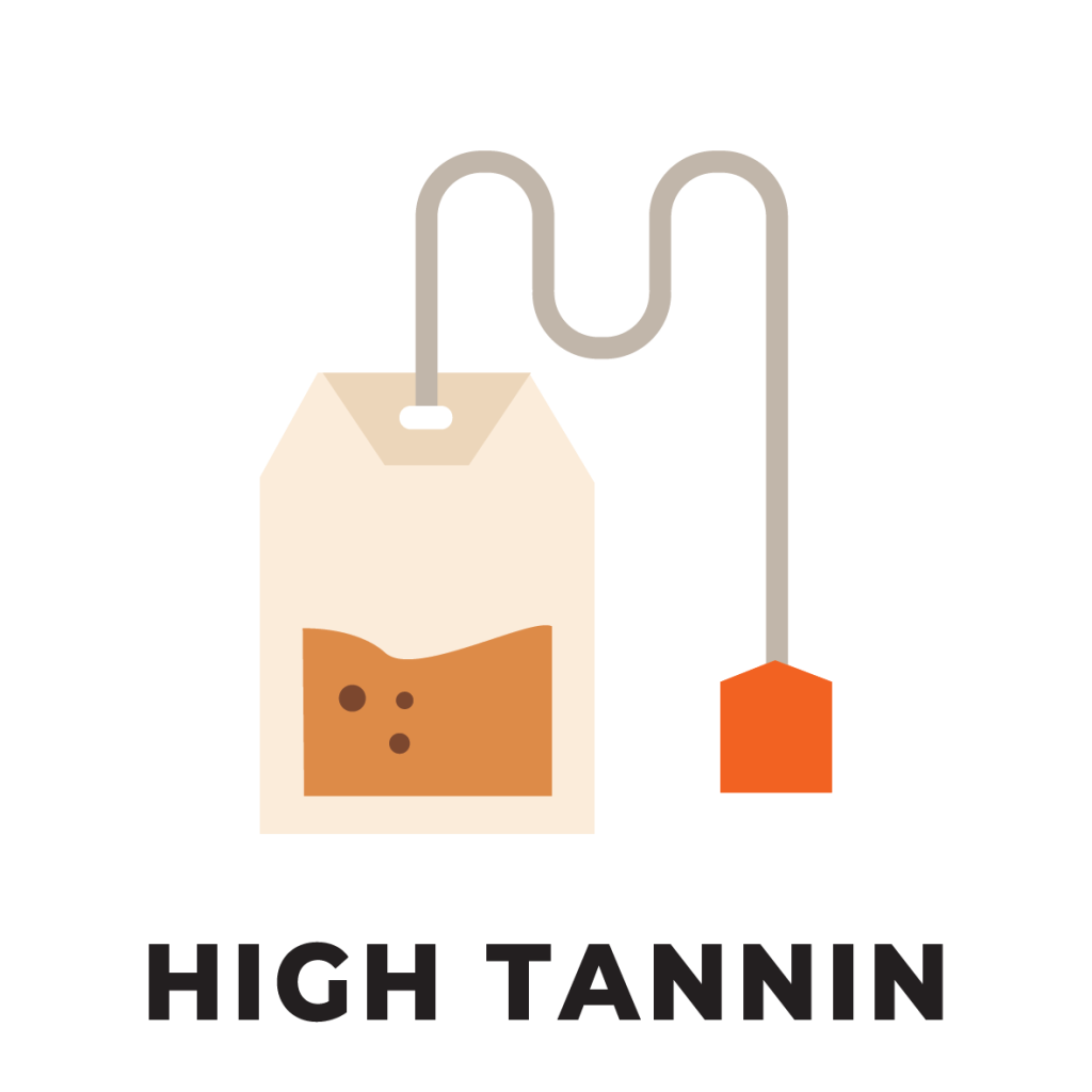 Cabernet Sauvignon will always be high in tannins. They are necessary to provide enough backbone, structure, and harmony to the wine. Tannins also help the wine age for decades. They’ll also often show herbaceous notes (green pepper) from the high levels of methoxypyrazines.