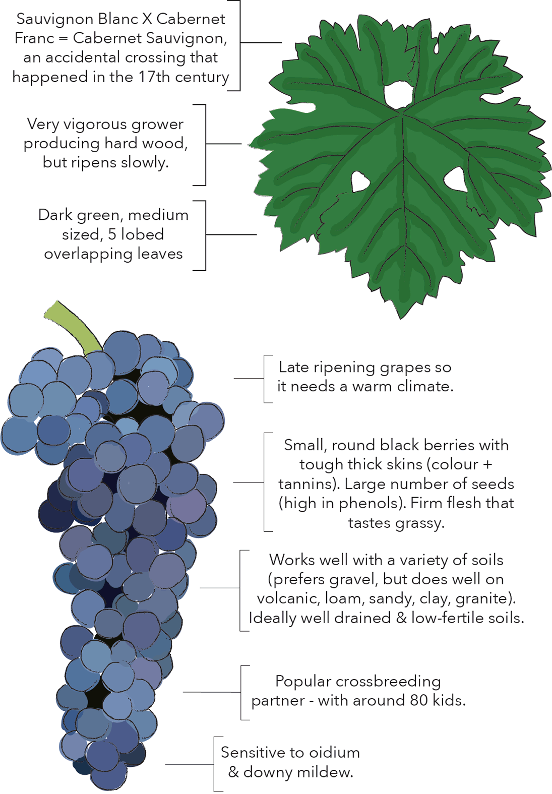 Cabernet Sauvignon is a cross between Cabernet Franc and Sauvignon Blanc. It is a late-ripening cultivar that needs a warm climate to fully ripen. Cabernet Sauvignon works well on a variety of soils, but it does best in gravel (arguably the absolute best) as well as volcanic, loam, sandy, and clay soils.