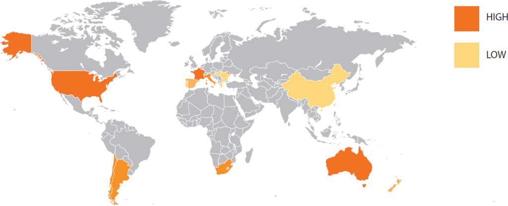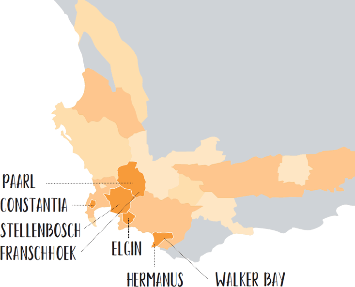 In terms of quality, cool regions like Walker Bay, Hemel-en-Aarde Valley, Elgin, and Constantia produce world-class wines. Foothills and higher-lying ground cooled by altitude and sea breezes allow areas like Stellenbosch, Paarl, and Franschhoek to also produce quality wines.