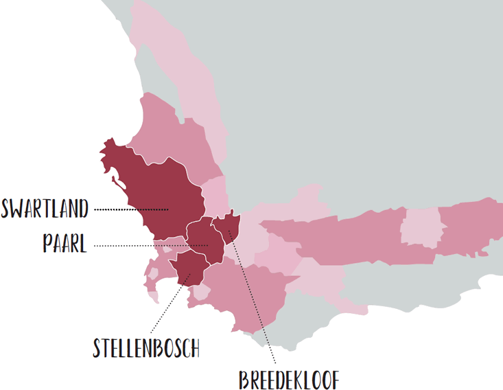 Pinotage is the third most planted red grape in South Africa. It makes up 7.2% of all the South African vine plantings, coming in before Merlot and behind Shiraz. Paarl, Swartland and Stellenbosch all have close to 2,000 hectares each, followed by Robertson at 875 hectares.